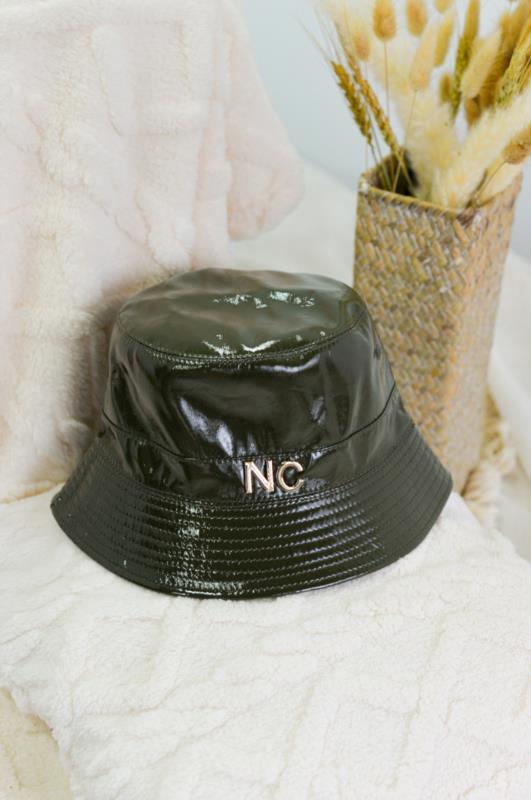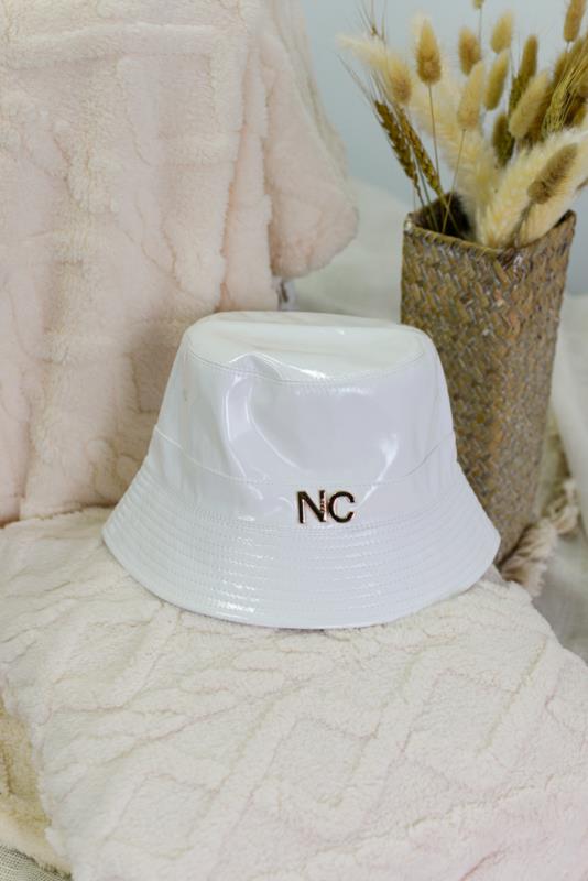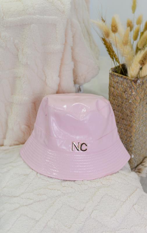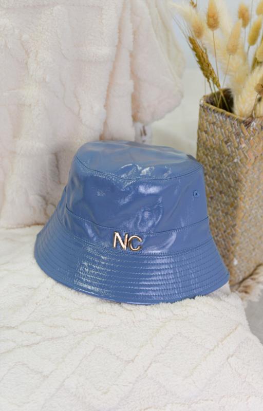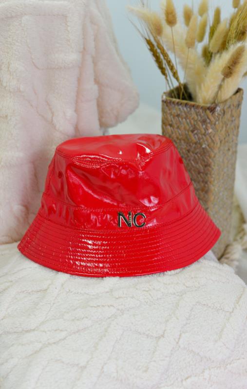 Gorro de formato bucket diseñado en charol de colores vivos con las iniciales de Noco en la parte frontal en metal dorado.