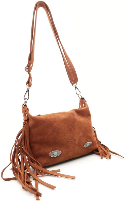 Bolso de piel serraje Flecos en color cuero de Caramelo by Ferchy. Diseño boho con flecos laterales, conchos decorativos y correa regulable. Suave, ligero y con gran capacidad, ideal para uso diario.