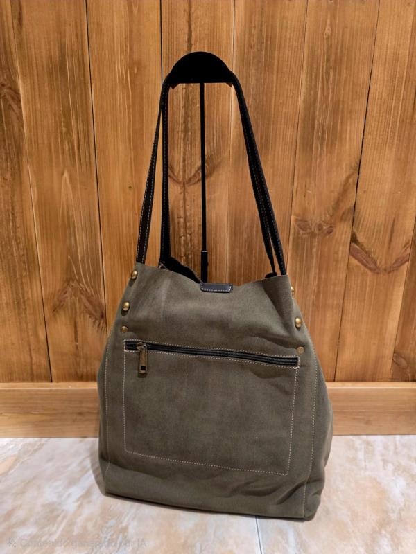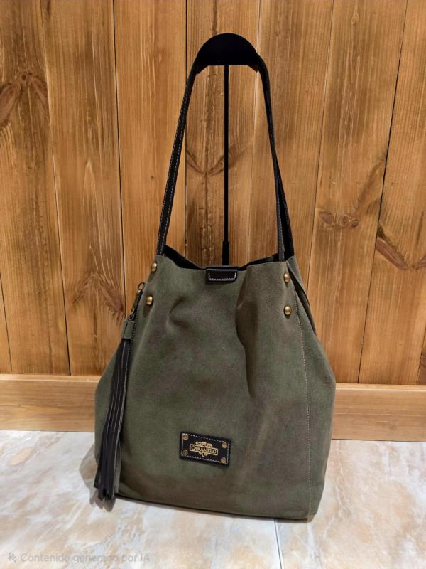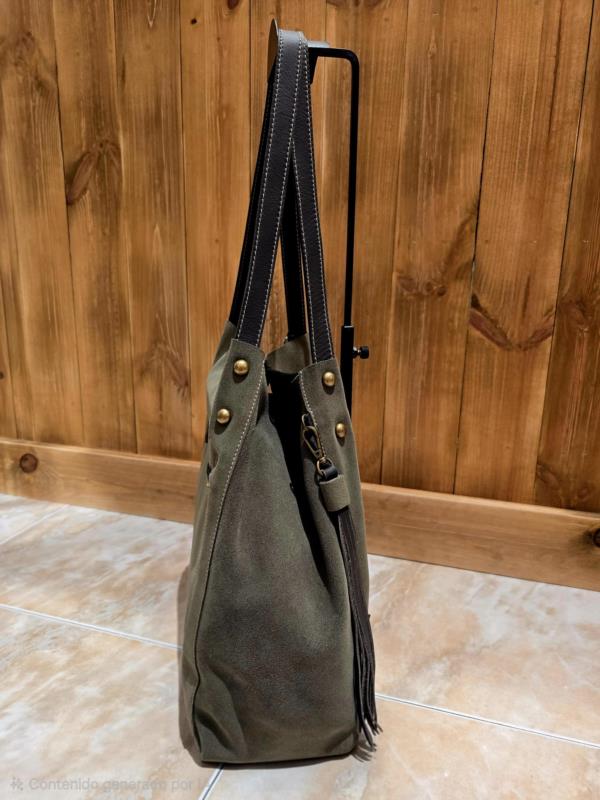 Un básico con alma sofisticada. Este bolso en piel serraje color kaki de Caramelo combina textura, funcionalidad y estilo atemporal.