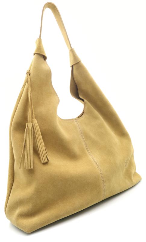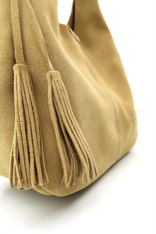 Bolso de piel serraje en color verde de Caramelo by Ferchy. Diseño tipo hobo, suave y flexible, con asa única al hombro y borla decorativa lateral. Costuras visibles que realzan su estilo artesanal. Amplio, ligero y perfecto para uso diario.