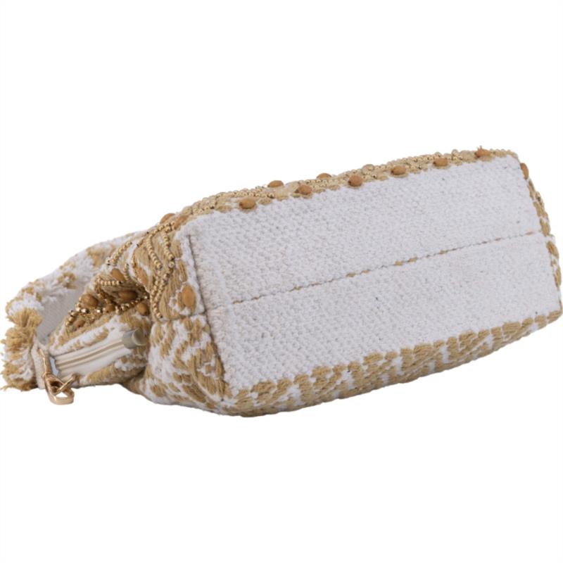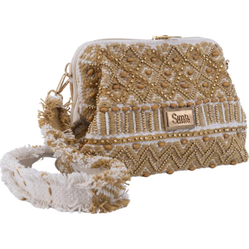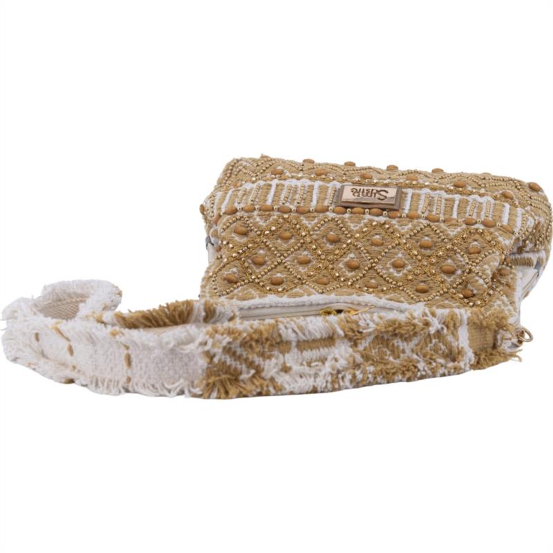 Clutch Savanah Oro de Simo Sastre, un bolso artesanal con bordados dorados y diseño elegante. Ligero, sofisticado y perfecto para completar cualquier look especial.