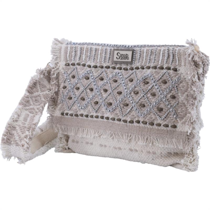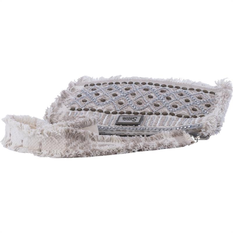 Clutch Savanah Plata de Simo Sastre, un bolso artesanal con detalles plateados y diseño boho-chic. Ligero, luminoso y perfecto para completar cualquier look especial.