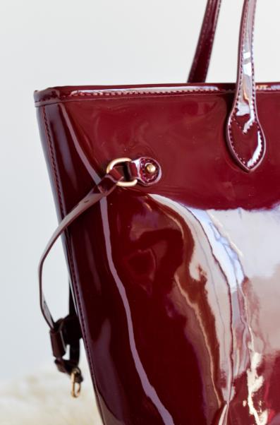 Un bolso shopper que combina brillo, elegancia y funcionalidad. Confeccionado en charol burdeos, este modelo destaca por su acabado sofisticado y sus detalles dorados que lo convierten en un imprescindible de temporada.
