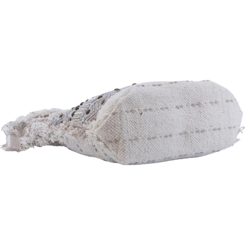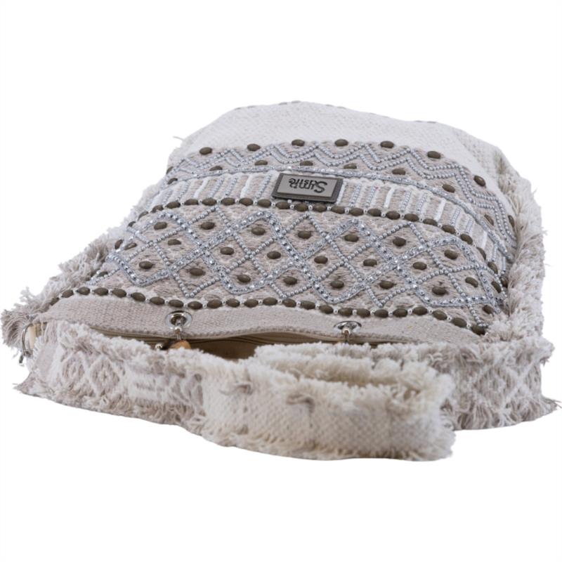Tote Savanah Plata de Simo Sastre, un bolso artesanal con detalles plateados y diseño étnico elegante. Su asa de bambú y su acabado textil lo convierten en un accesorio único y luminoso para cualquier look.