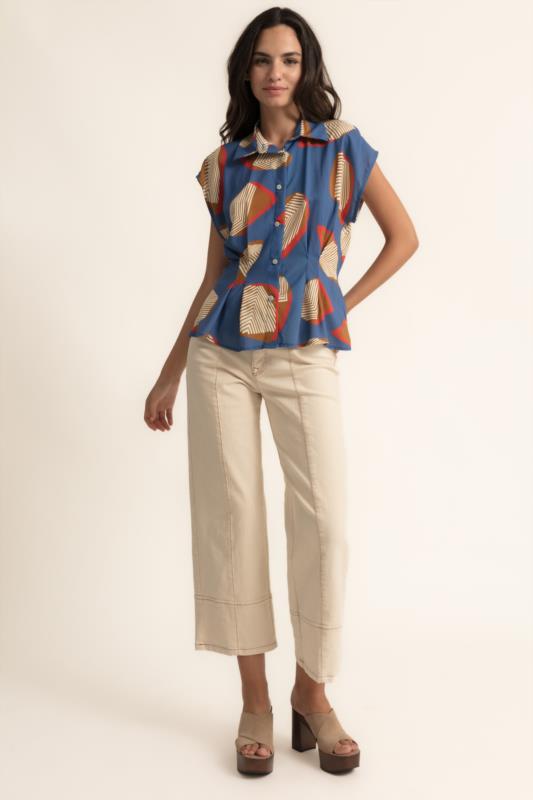 Blusa de manga corta con estampado geométrico en tonos azul, rojo, crema y camel. Tejido ligero, corte recto y caída fluida. Una prenda cómoda, llamativa y perfecta para dar color a cualquier look.