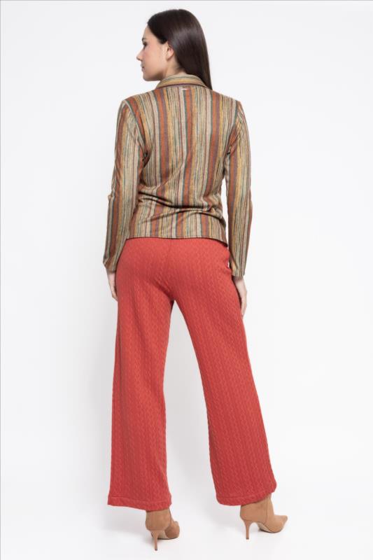 Una explosión de estilo y textura. Esta camisa de punto combina tonos tierra —verde oliva, mostaza, naranja quemado y marrón— en un patrón de rayas verticales que estiliza la figura y aporta calidez visual. Confeccionada en tejido de punto suave y elástico, se adapta cómodamente al cuerpo sin perder su estructura.