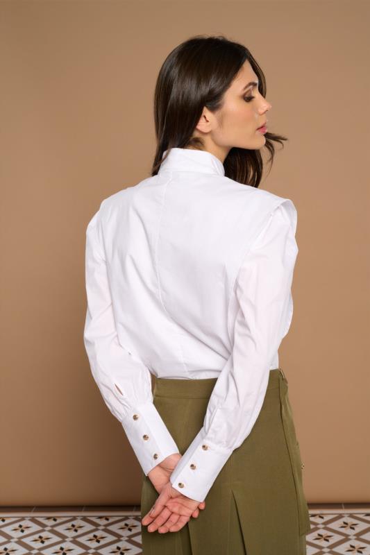 CAMISA MARTINA blanca con solapa amplia y botones dorados. Esta camisa blanca es sinónimo de sofisticación. Su diseño destaca por una amplia solapa estructurada que cubre los hombros y se extiende hacia el pecho, creando una silueta imponente y refinada. Los botones dorados, tanto en el frente como en los puños, aportan un toque de lujo y distinción. Las mangas largas y abullonadas terminan en puños ajustados, añadiendo volumen y elegancia al conjunto. El cuello alto cerrado refuerza su aire formal, convirtiéndola en una prenda ideal para eventos especiales, reuniones o para elevar un look diario con estilo. Perfecta para combinar con pantalones de vestir, faldas midi o incluso jeans para un contraste chic.