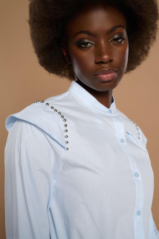 CAMISA VIRGINIA azul con tachuelas. Elegancia con un toque rebelde. Esta camisa de manga larga en tono azul claro combina la frescura del color con detalles que marcan la diferencia. Su diseño incluye tachuelas plateadas en los hombros, aportando un aire moderno y atrevido que rompe con lo clásico. El cuello camisero y la abotonadura frontal mantienen la estructura tradicional, mientras que las mangas abullonadas con puños ajustados añaden volumen y sofisticación. Confeccionada en tejido ligero y suave, es perfecta para looks urbanos, de oficina o incluso para eventos informales con estilo. Combínala con faldas de mezclilla, pantalones de vestir o jeans para crear outfits versátiles y llenos de personalidad.