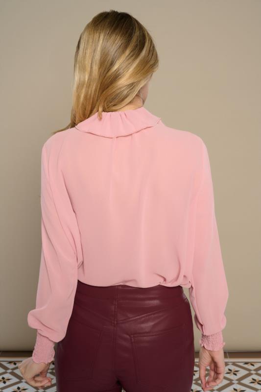 TOP ADRIENNA rosa con volantes – Romanticismo moderno con carácter. Esta camisa de manga larga en tono rosa claro es una pieza delicada y sofisticada que aporta un aire romántico a cualquier look. Su diseño destaca por los volantes frontales que se extienden desde el cuello hasta el pecho, creando textura y movimiento con un toque femenino. Los puños fruncidos añaden volumen a las mangas, equilibrando la silueta con elegancia. Confeccionada en tejido ligero y fluido, esta camisa es ideal para ocasiones especiales, looks de oficina o estilismos urbanos con un giro refinado. Combínala con pantalones de cuero, como en la imagen, para un contraste moderno y atrevido, o con faldas midi para un outfit más clásico. Una prenda versátil que mezcla dulzura y estilo contemporáneo, perfecta para quienes buscan destacar con elegancia.