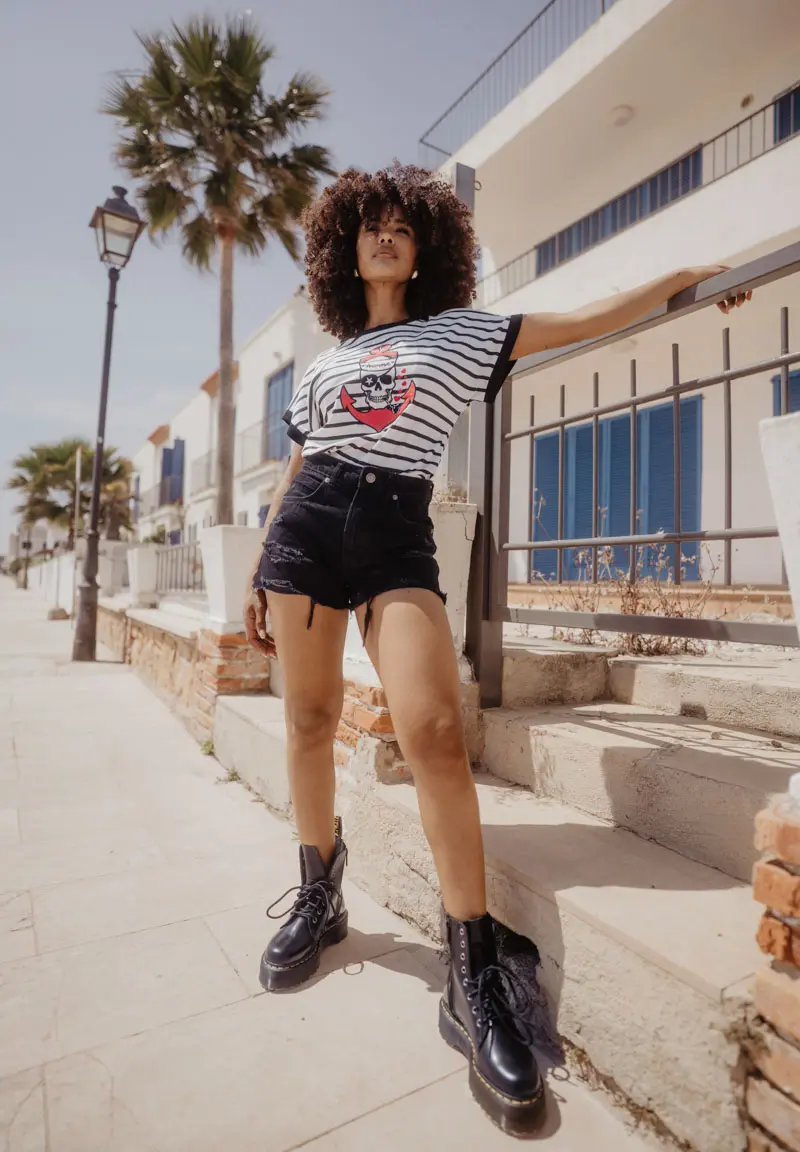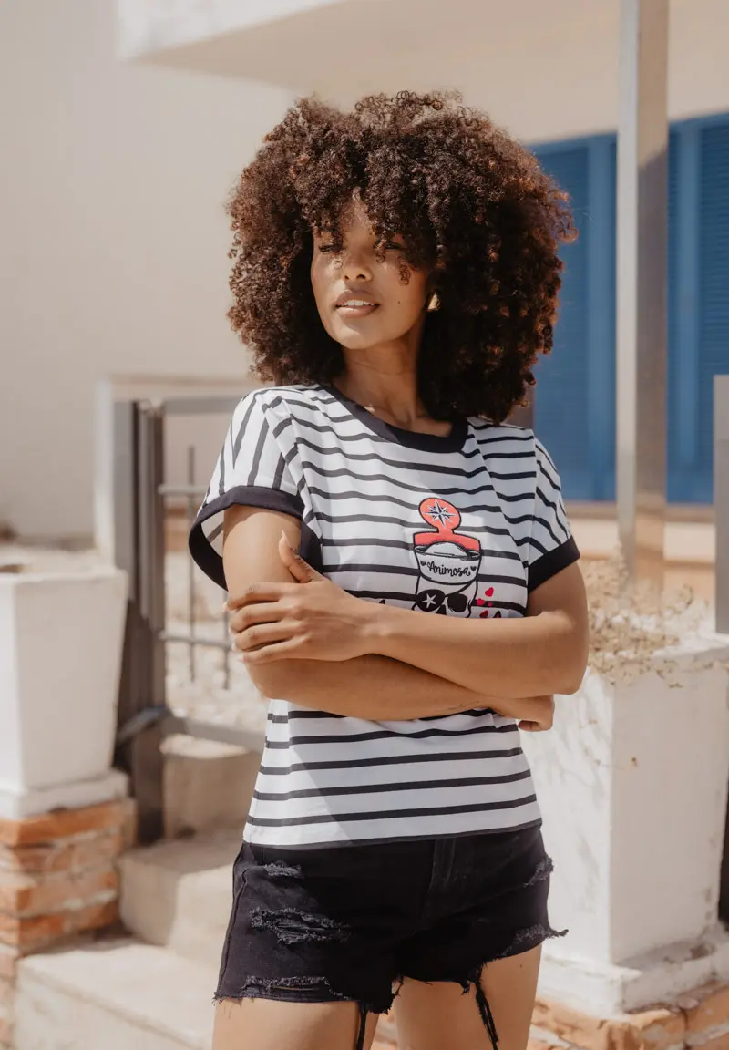 Camiseta manga ranglan de rayas, con vivo del escote y las mangas a contraste en negro.