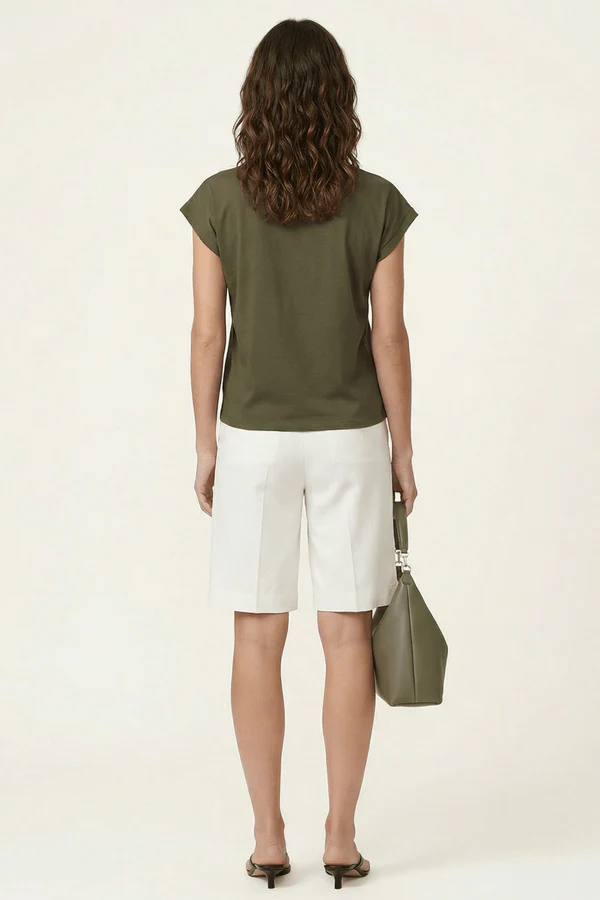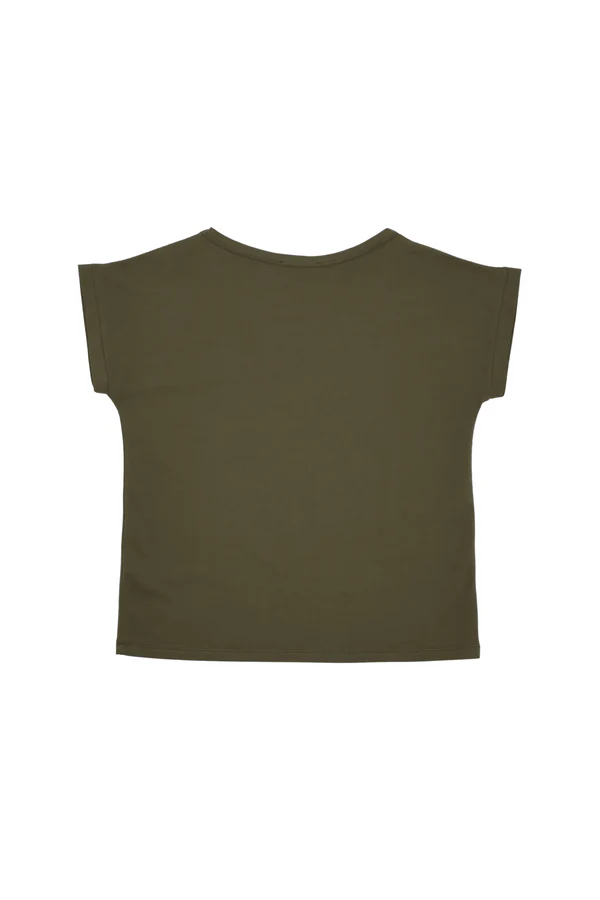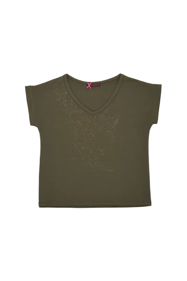 Camiseta verde caqui con aplicaciones de strass dorados formando tigre - Escote pico - Algodón elástico - Fabricada en Portugal