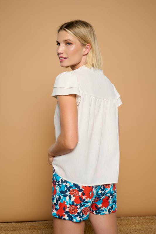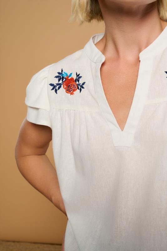 Blusa blanca con bordados en tonos rojos y azules, ligera y favorecedora, perfecta para dar un toque especial a cualquier look de verano.