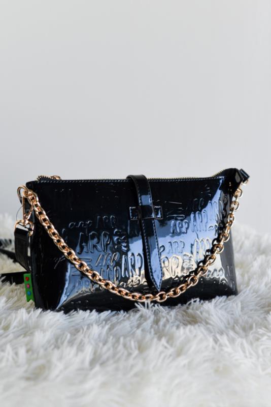 Una pieza sofisticada que combina el brillo del charol con detalles modernos. Esta cartera en charol azul marino con logo en relieve es perfecta para elevar cualquier look.