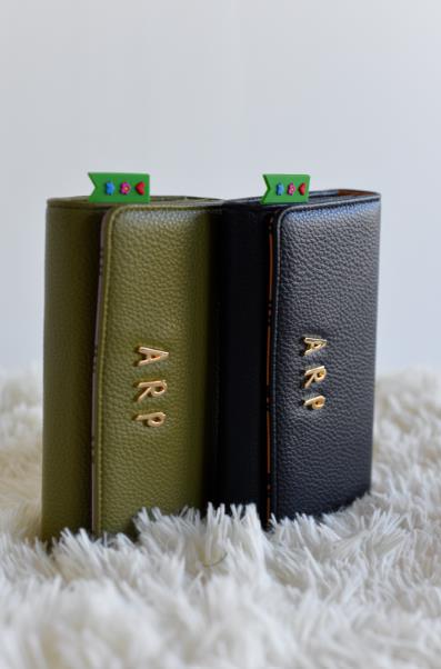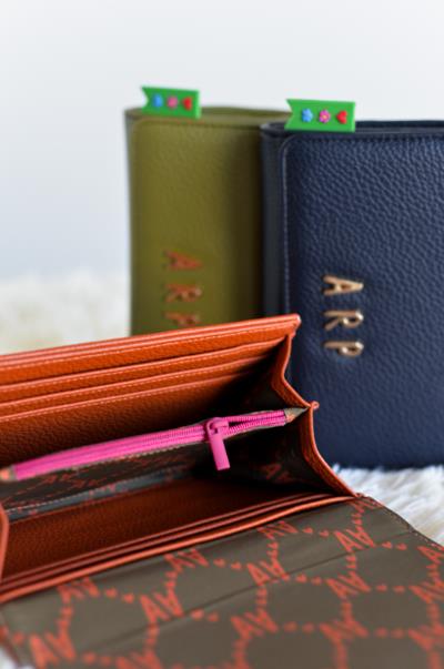 Monograma metálico: Iniciales ARP en dorado que destacan sobre el material texturizado.