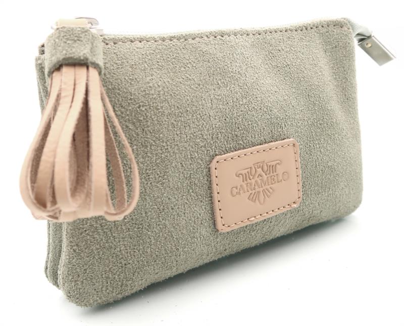 Monedero de piel serraje en color agua, firmado por Caramelo by Ferchy. Diseño compacto y suave al tacto, con cierre de cremallera y borla decorativa. Incluye parche frontal grabado con el logo de la marca. Ideal para monedas, tarjetas y pequeños esenciales.