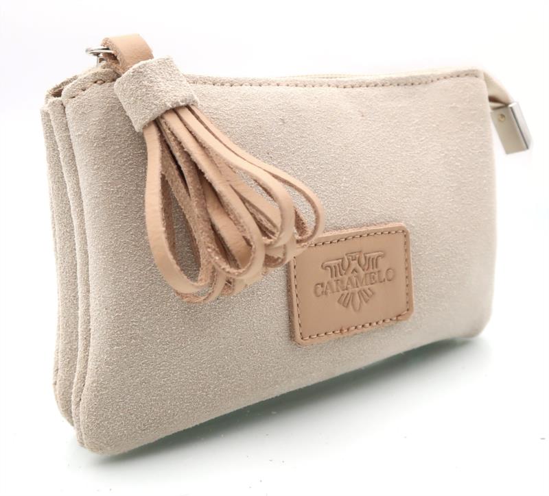 Monedero de piel serraje en color beige, firmado por Caramelo by Ferchy. Diseño compacto y suave al tacto, con cierre de cremallera y borla decorativa. Incluye parche frontal grabado con el logo de la marca. Ideal para monedas, tarjetas y pequeños esenciales.