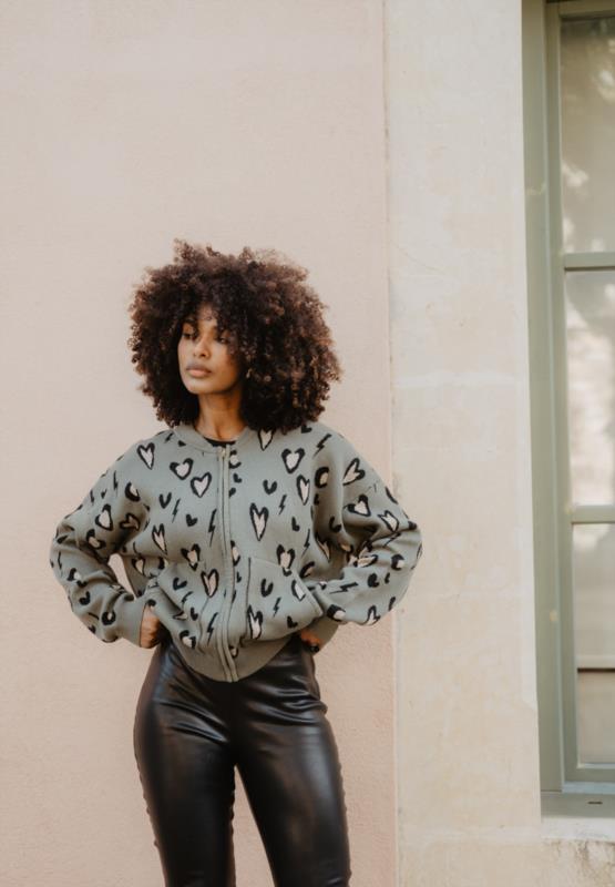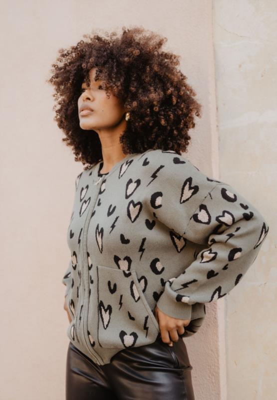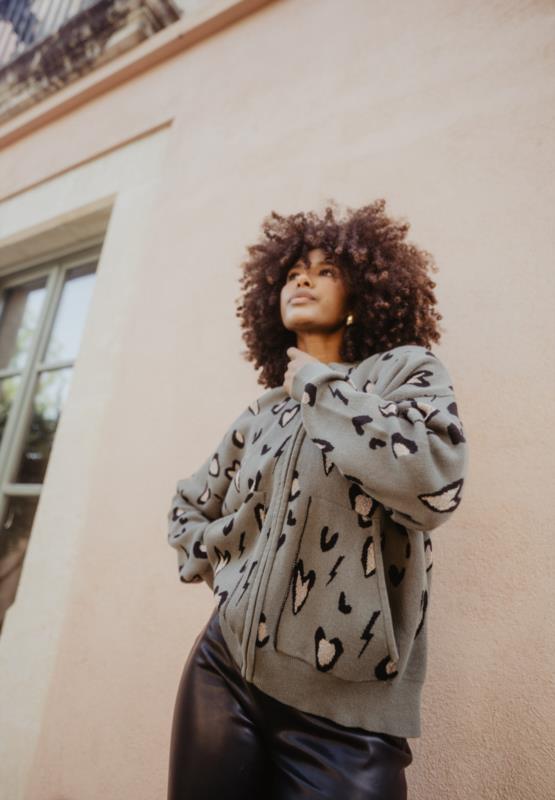 Chaqueta tipo bomber de punto, con nuestro ya característico estampado animal print de corazones y rayos. ¿Sabías que la gueparda, como animal espiritual, representa tu capacidad para enfrentar desafíos con determinación?