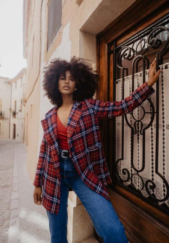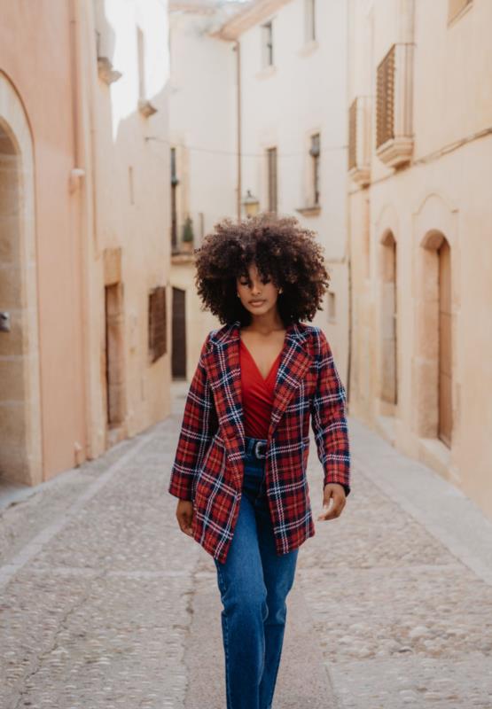 Chaqueta de cuadros escoceses con leopardas en la espalda. ¿Sabías que tanto el tartán de cuadros como el animal print pasaron de representar poder y estatus a convertirse en símbolos de transgresión y autoexpresión?