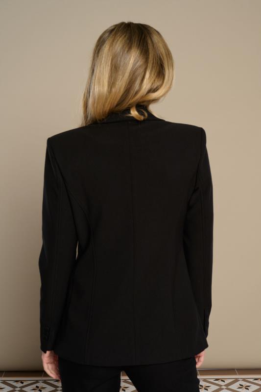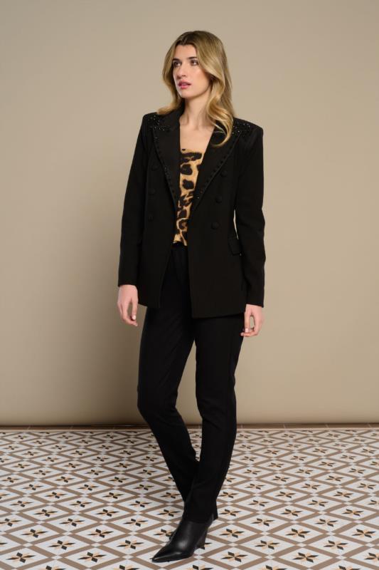 CHAQUETA VALERIA negra con tachuelas y doble botonadura – Elegancia con actitud. Esta chaqueta negra de corte estructurado es una pieza versátil que combina el estilo clásico con detalles modernos y atrevidos. Su diseño de doble botonadura con botones grandes aporta sofisticación, mientras que las tachuelas metálicas en los hombros y el borde decorativo en la solapa añaden un toque rebelde y contemporáneo. Confeccionada en material de alta calidad, ofrece una silueta favorecedora y cómoda. Los dos bolsillos laterales funcionales completan el diseño, ideal para looks urbanos, profesionales o incluso para elevar un outfit casual. Perfecta para combinar con estampados animales, como en la imagen, o con prendas lisas para destacar su carácter. Una chaqueta pensada para mujeres que buscan destacar con estilo y personalidad.