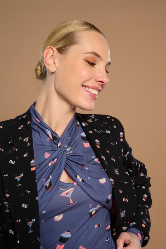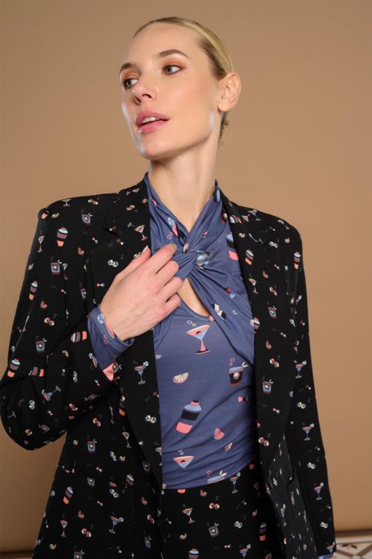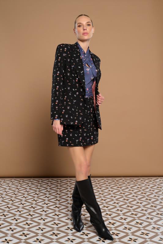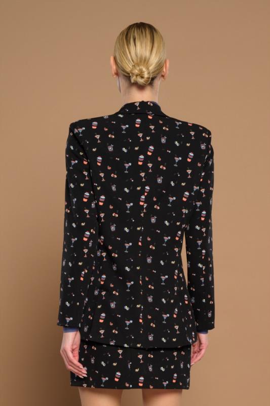 CHAQUETA ZIA negra con estampado de cócteles y corte clásico Esta chaqueta negra rompe con lo convencional gracias a su original estampado de cócteles en tonos rojos, azules y blancos. Con un corte clásico de solapas y bolsillos frontales, combina elegancia con un toque divertido y sofisticado. Perfecta para destacar en eventos sociales o cenas especiales, puede llevarse sola o como conjunto con la falda a juego. El diseño es ideal para quienes buscan una prenda con personalidad, que mezcle estilo formal con guiños creativos. Combínala con blusas llamativas o prendas lisas para dejar que el estampado hable por sí solo.