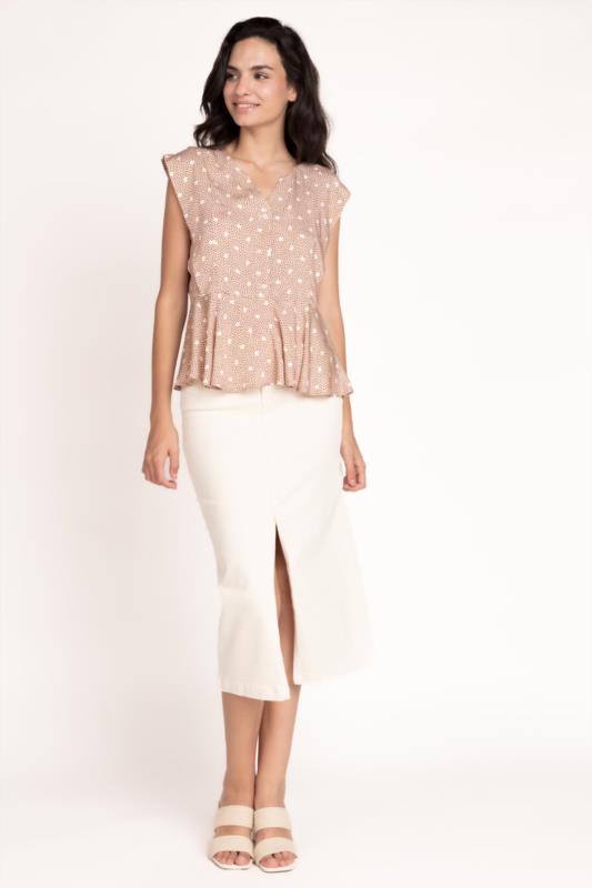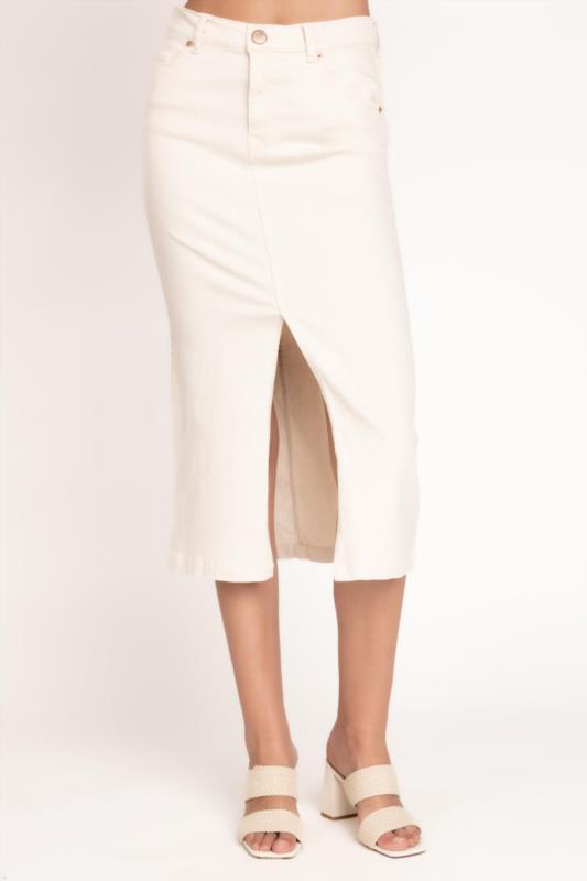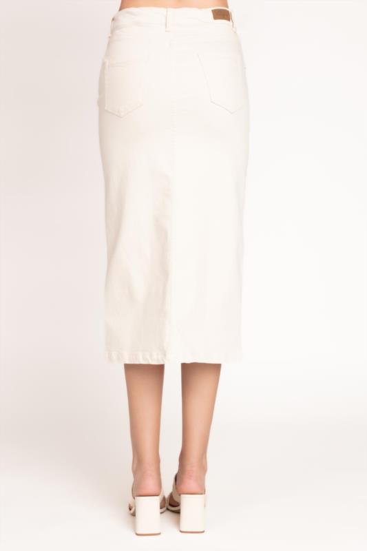 Añade un toque de elegancia a tu guardarropa con la sofisticada falda midi HELOISA en color blanco crema. Con una longitud que llega hasta la mitad de la pantorrilla, esta falda presenta una abertura frontal que comienza justo por encima de las rodillas, aportando un detalle moderno y chic. La pretina con trabillas para cinturón, un botón metálico en la parte superior y una cremallera oculta aseguran un ajuste perfecto y cómodo. Además, cuenta con bolsillos delanteros y traseros que combinan funcionalidad con estilo.