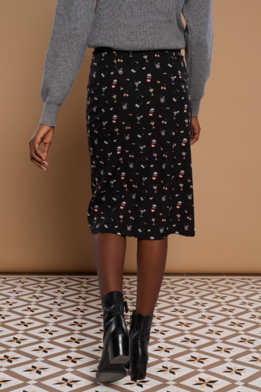 FALDA VENECIA negra con estampado de cócteles y botones frontales. Esta falda negra es pura diversión con estilo. Su original estampado de cócteles en colores vivos aporta un toque desenfadado y sofisticado, ideal para quienes buscan destacar con prendas únicas. El diseño recto y la fila de botones frontales le dan un aire clásico con un giro moderno. Confeccionada en un tejido cómodo y estructurado, es perfecta para combinar con la chaqueta a juego o con prendas lisas que dejen brillar el estampado. Ideal para looks de día con botas o para noches con tacones y accesorios llamativos. Una pieza versátil que mezcla elegancia, humor y personalidad.