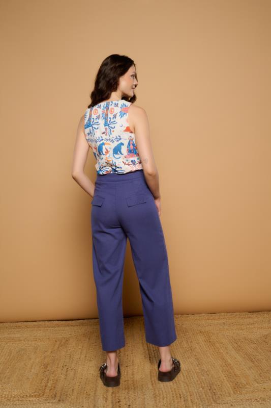 Pantalón azul de tiro alto con pernera ancha, elegante y cómodo, perfecto para crear looks veraniegos con un toque moderno.