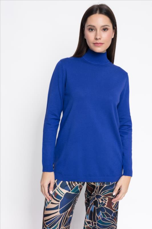 Un básico con carácter. Este jersey de cuello Perkin en azul vibrante aporta un toque moderno y sofisticado a cualquier look. Su diseño limpio y ligeramente estructurado lo convierte en una prenda versátil, ideal tanto para estilismos relajados como para combinaciones más atrevidas.