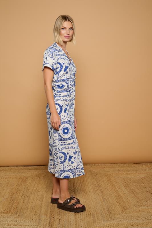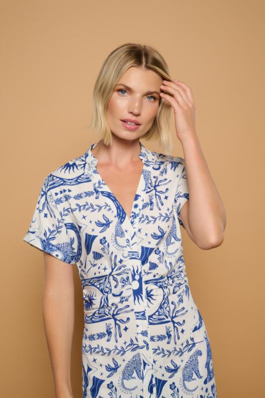 Vestido blanco con estampado azul y corte camisero, ligero y elegante, con abertura frontal que aporta movimiento y un toque muy veraniego.