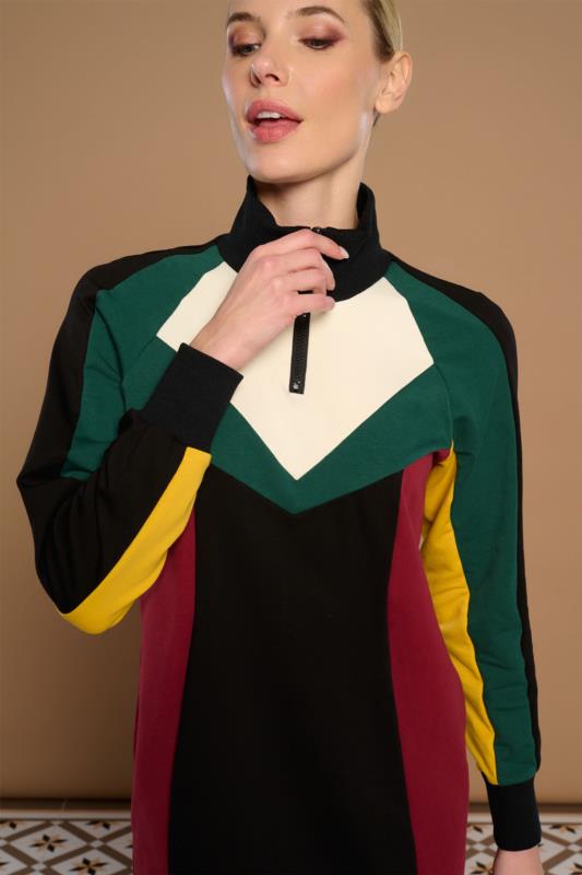 VESTIDO BEATA geométrico multicolor con cremallera frontal. Este vestido de manga larga es una pieza audaz y moderna que combina diseño gráfico con una paleta de colores intensa. El patrón en forma de “V” en el pecho, con blanco en el centro rodeado de verde oscuro y negro, crea una silueta visualmente estilizada. Los laterales en rojo burdeos y las franjas amarillas en las mangas aportan contraste y energía al conjunto. Con cierre de cremallera en el cuello alto, este vestido mezcla funcionalidad y estilo contemporáneo. El corte recto y los bloques de color lo convierten en una prenda ideal para destacar en eventos urbanos, salidas nocturnas o looks de día con carácter. Combínalo con botas altas, como en la imagen, para un outfit potente y sofisticado.