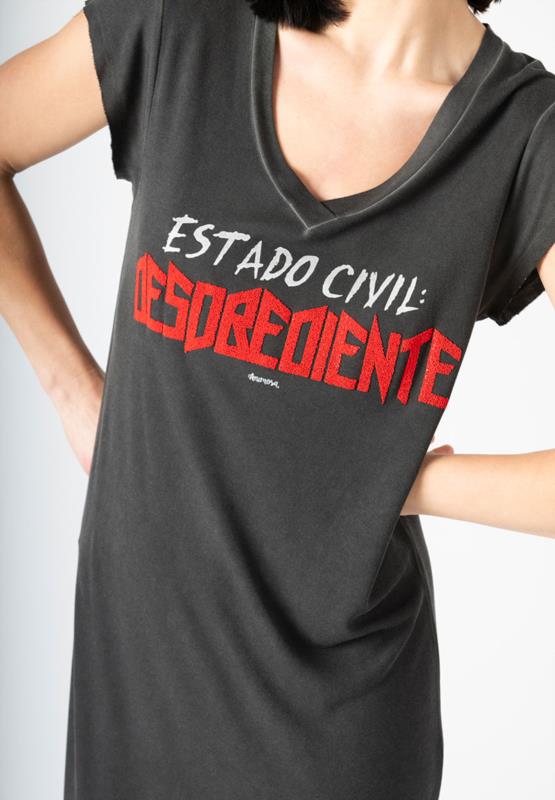 Vestido con la frase «Estado Civil: Desobediente». Dedicada a las mujeres que han dicho basta a los convencionalismos. Ya sabemos qué responder la próxima vez que nos pregunten: ¿Soltera o casada?